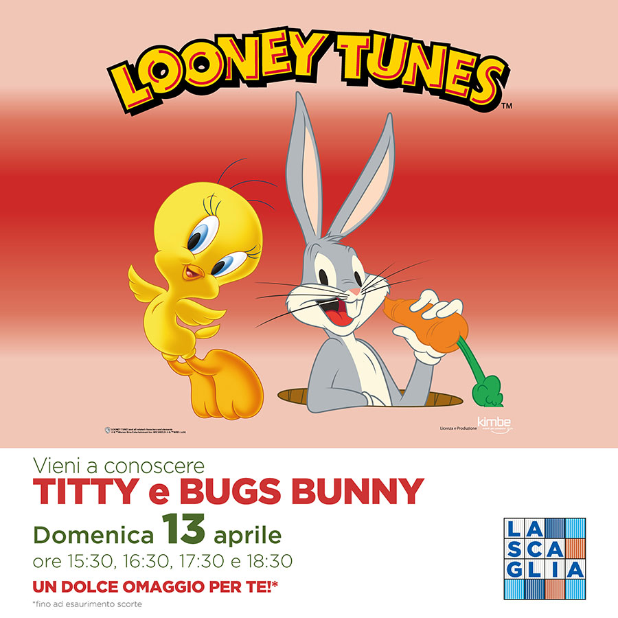 Vieni a conoscere Titty e Bugs Bunny ✨ Domenica 13 aprile al Centro Commerciale La Scaglia arrivano Titty & Bugs Bunny! Vieni a trascorrere un pomeriggio di divertimento e dolcezza con i tuoi personaggi preferiti! 🍬🕒 Orari: 15:30 | 16:30 | 17:30 | 18:30Non mancare! 🎈